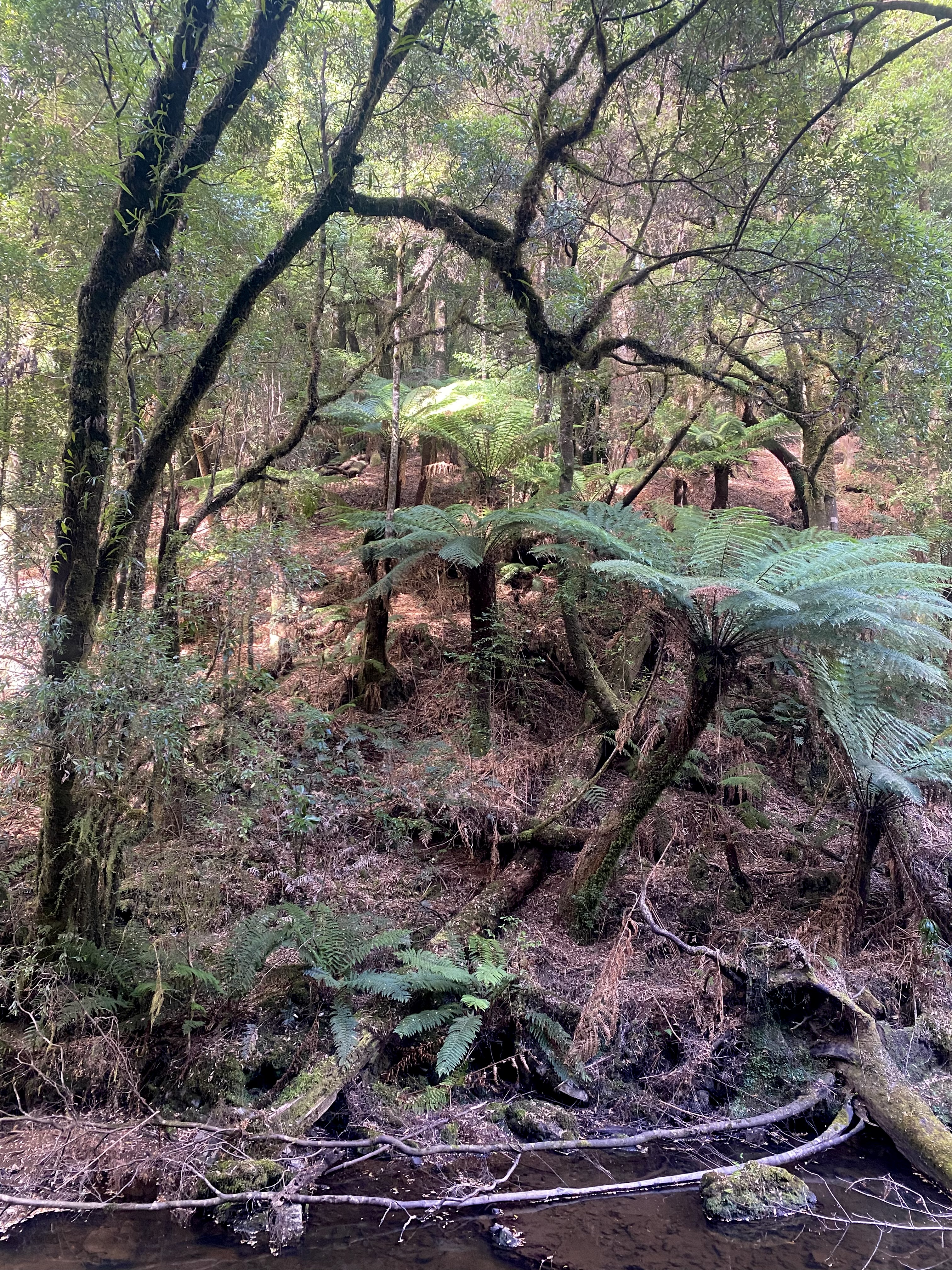 I pass over a bridge that spans the Arthur River. It’s sides are worn soft from past gushes of melt water and there are large trunks of trees and branches at the sides that have not made the trip down river last winter and spring. There is no one on the roads yet, I have not met a car since I left my camping place some hours ago. I drive this Tarkin drive slowly. Tarkin means ‘of the place’. Much to take in and to remember. Wild life around me hops out of the way at their own pace. They are slow but I am slower. Tasmanian chickens, small birds flashing green, others with illuminated plumage all just doing their thing. The sun is out now after a coldish night, an autumnal feeling is in the air and some trees are starting to drop their foliage. The finger shaped leaves of the eucalyptus cast their short shadows across the dash of the van in sunlight.