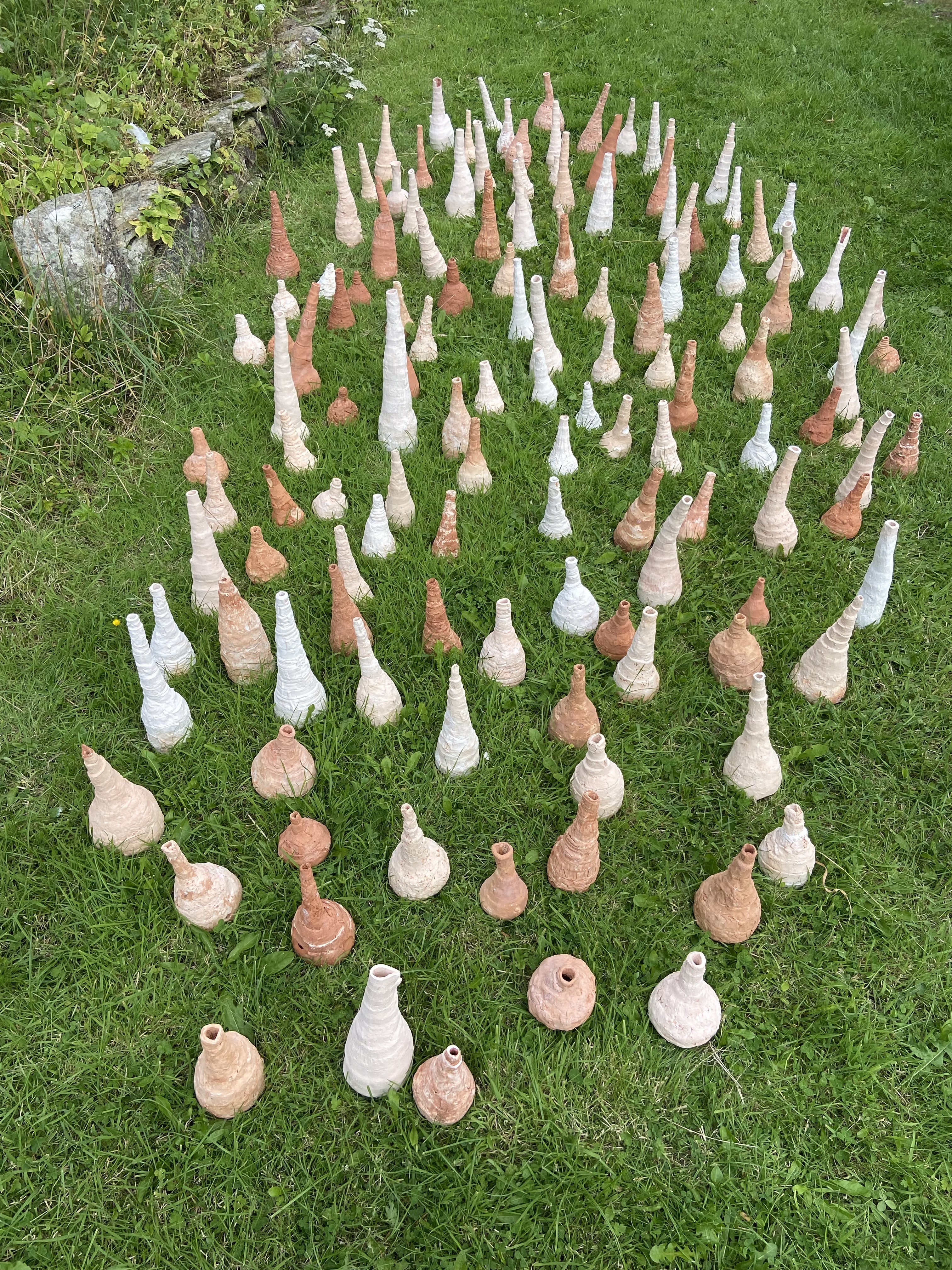 These objects/pots/vessels/individuals are unglazed. Each one is exposing it’s existence; our life’s journey. We carry our individual experiences; some we show – many we don’t. Each vessel is single but unites as one artwork, reflecting on the links and ties we have within a community and the wider world.