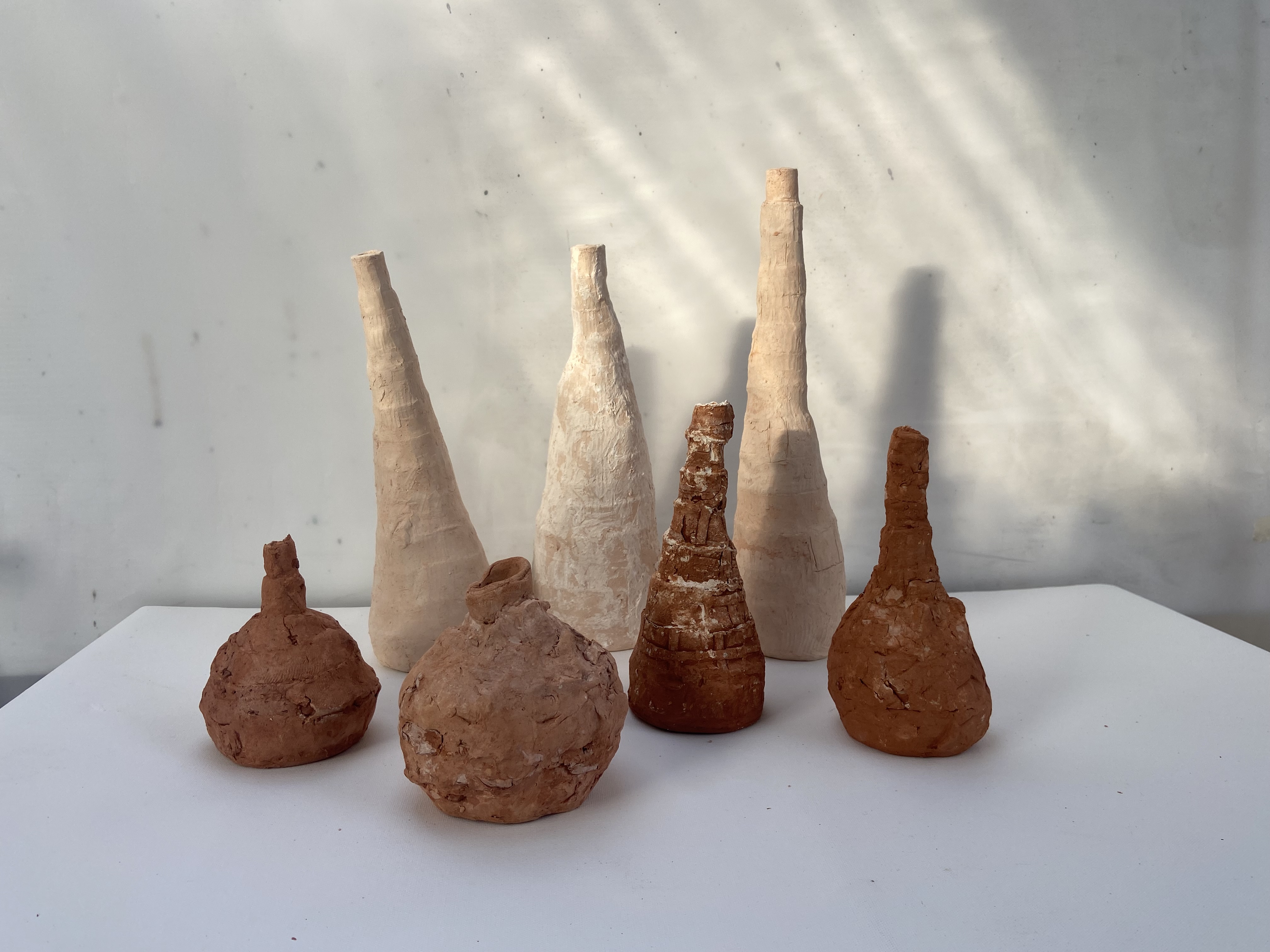 I have used clay that is factory made as well as locally sourced earth, processed to become a workable material, adding local vegetation. The more I do these, the more I am getting into the texture. I let the clay lead me, the knife cuts in lines that waver, but I do not want to use a ruler and measure, the wavy lines show more about the lives we lead, which, is what each of these vessels represents – a life, a person.